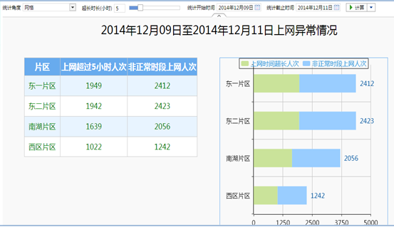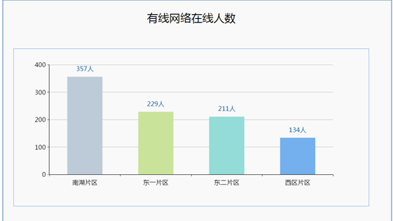 該部分只有柱狀圖展現在線人數,柱子滿足維度下鉆至樓棟。該部分數據直接來自中間視圖表,數據每隔一分鐘更新一次,用計劃任調用后臺etl過程更新數據。報表也每隔一分鐘重新自動計算一次。從而達到網絡在線實時情況展現這一目標。