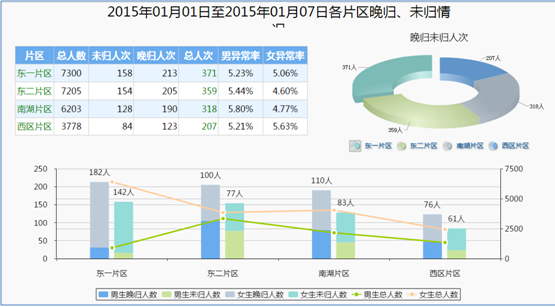 通過時間參數段內的未歸人次、晚歸人次、男女異常率指標展示。