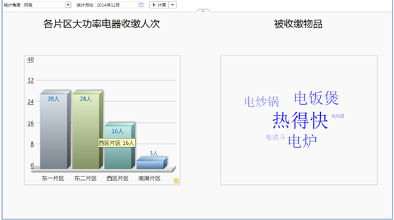 該部分內容主要以圖形顯示,是柱狀圖和詞云圖的結合體。鉆取到最細力度是學生未歸電器收繳明細列表,包括學生的基本信息以及收繳的電器和收繳時間。