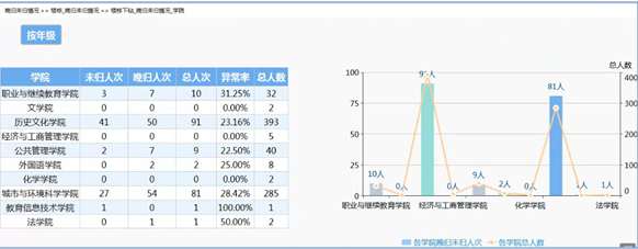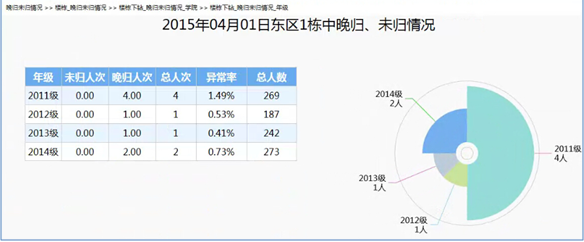 其中總人次下鉆到詳細列表,列表中某個學生的總次數指標還可以下鉆都其異常的具體時間。而維度是層層下鉆,當鉆取到樓棟后,再鉆取則以學院和年級為維度展現:
