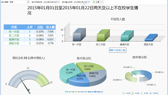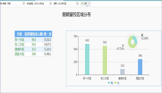 留校區域使用混合圖,柱子展現人數、餅圖展現男女比例,支持維度下鉆以及人數下鉆至明細列表。預警部分類似不在校預警,僅列入假期信息。
