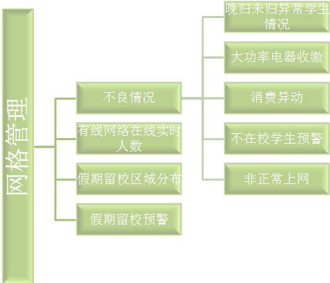 網格部分旨在進行網格化數據分析與展現,涉及內容包括宿舍管理,學生學業、生活、消費健康安全等各項內容。何謂網格化管理,即仿效社區的網格化管理,按照一定的規則劃分成網格單元,每個網格單元分別管理。目標更加明確,管理更加細致。