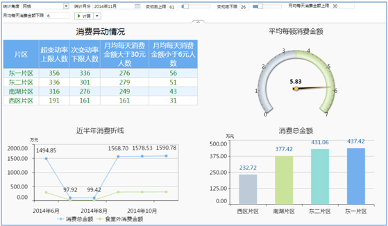 通過學生在食堂刷卡消費的明細數據進行整體分析,統計異動人次,再則鉆取到其消費明細。參數多樣,可滿足不同要求標準的數據展現。
