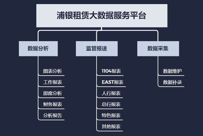 基于監(jiān)管報(bào)表生成質(zhì)量無法得到有效保證、內(nèi)外部數(shù)據(jù)的統(tǒng)計(jì)分析工作成為日常辦公基本需要、各部門對(duì)數(shù)據(jù)服務(wù)提出較高要求等問題,浦銀租賃大數(shù)據(jù)服務(wù)平臺(tái)總體設(shè)計(jì)分為數(shù)據(jù)分析、監(jiān)管報(bào)送和數(shù)據(jù)采集三大模塊。