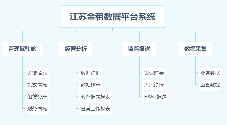江蘇金租數據平臺系統目前開發完成的主要是管理駕駛艙、經營分析、監管報送、數據采集四大模塊。系統業務功能架構見下圖: