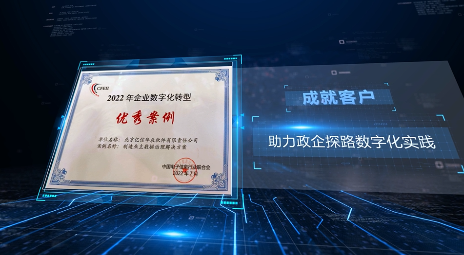 在工信部和廣東省人民政府聯(lián)合主辦的2022中國數字經濟創(chuàng)新發(fā)展大會的“企業(yè)數字化轉型引領制造業(yè)高質量發(fā)展論壇"上,億信華辰制造業(yè)主數據管理解決方案被評為2022年企業(yè)數字化轉型優(yōu)秀案例。