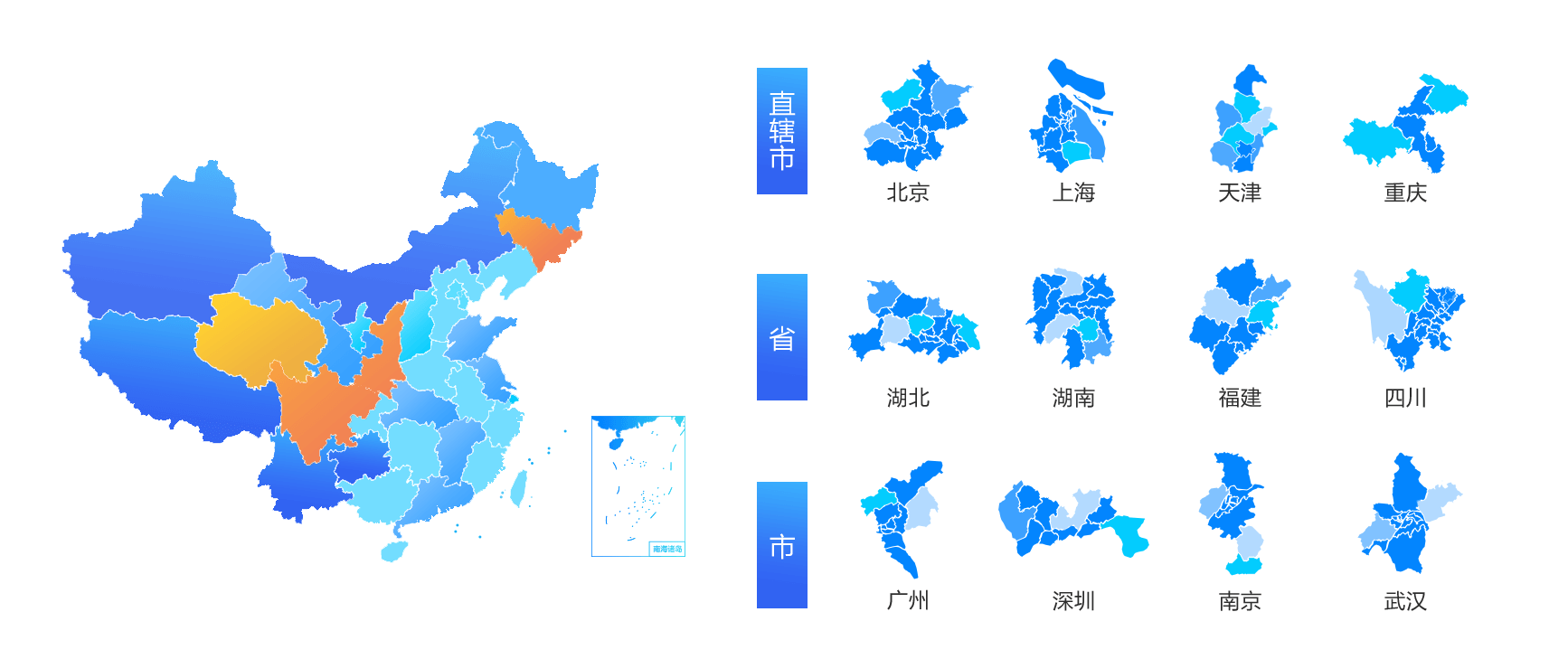 內(nèi)置五大洲及世界地圖、中國地圖,囊括中國34個(gè)省239個(gè)市區(qū)縣的地圖,地圖類型包塊FLASH、圖片和HTML5格式,同時(shí)支持個(gè)性化定制地圖。