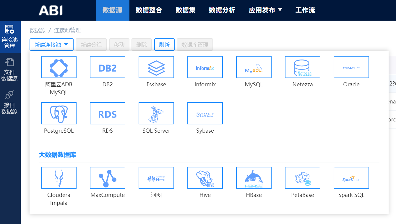 第一步,就是對接數據庫,億信ABI支持對接包括:Mysql、Oracle、SQL Server、DB2、GBase、PetaBase、Essbase等多種數據庫,而且還支持各種其他類型文件的導入數據,包括excel、txt、csv、db等等文件。
