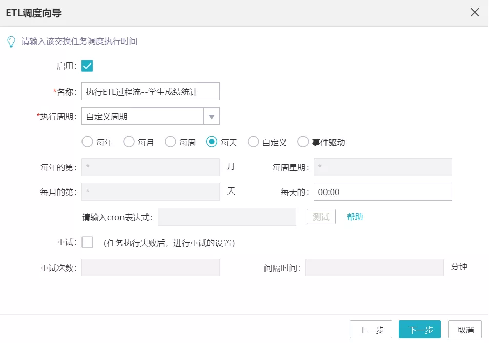 一般情況下,ETL過(guò)程都會(huì)伴隨著調(diào)度任務(wù)的設(shè)置。比如,某銷(xiāo)售部門(mén)需要每周五抽取數(shù)據(jù)計(jì)算當(dāng)周銷(xiāo)售利潤(rùn)用于匯報(bào),如果利用ETL實(shí)現(xiàn),時(shí)間調(diào)度管理必不可少。億信ABI的ETL調(diào)度導(dǎo)向,深度考慮各使用場(chǎng)景,用戶(hù)只需簡(jiǎn)單操作,即可實(shí)現(xiàn)復(fù)雜的調(diào)度任務(wù)。