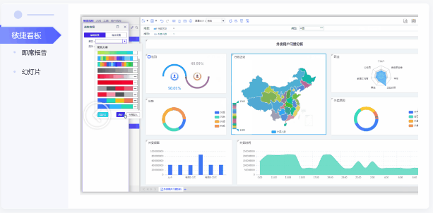 敏捷看板,即席報告,幻燈片等多種分析方式,使數(shù)據(jù)分析更貼近用戶應(yīng)用的場景。并且提供多種可視化組件:表格、常規(guī)統(tǒng)計(jì)圖、html5統(tǒng)計(jì)圖、地圖等。