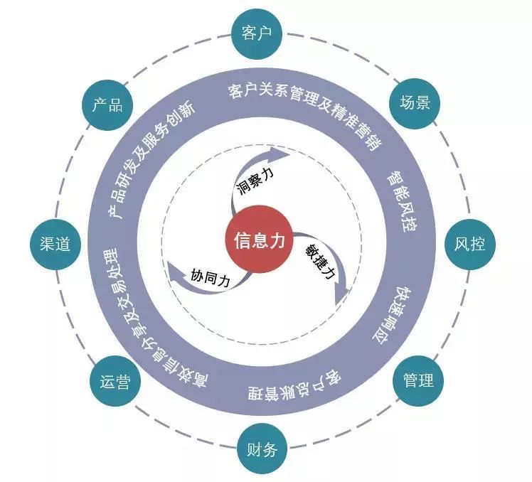 銀行業作為信息技術應用和創新非常充分的行業,天然具有培育強大信息力的基因。目前,依托于信息力原子能力的釋放,引領型銀行已經在產品研發及服務創新、高效信息分享及交易處理、客戶總賬管理、快速響應、智能風控、客戶關系管理及精準營銷等六大金融服務能力建設方面發揮重要作用,并進一步形成銀行在客戶、產品、場景、渠道、財務、管理、風控、運營等領域的核心競爭力。